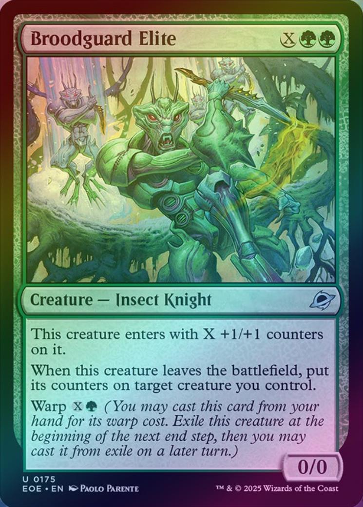 Broodguard EliteCasting Cost: Card Type: Creature - Insect KnightPower/Toughness: 0/0Card Text: This creature enters with X+1/+1 counters on it. When this creature leaves the battlefield, put its counters on target creature you control. Warp (You may cast this card from your hand for its warp cost. Exile this creature at the beginning of the next end step, then you may cast it from exile on a later turn.)Artist: Paolo Parente
