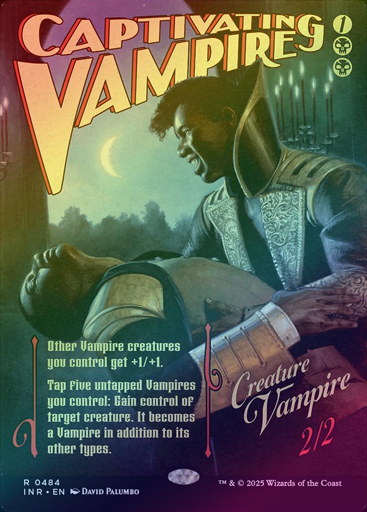 Captivating VampireCasting Cost: Card Type: Creature - VampirePower/Toughness: 2/2Card Text: Other Vampire creatures you control get +1/+1. Tap five untapped Vampires you control: Gain control of target creature. It becomes a Vampire in addition to its other types.Artist: David Palumbo