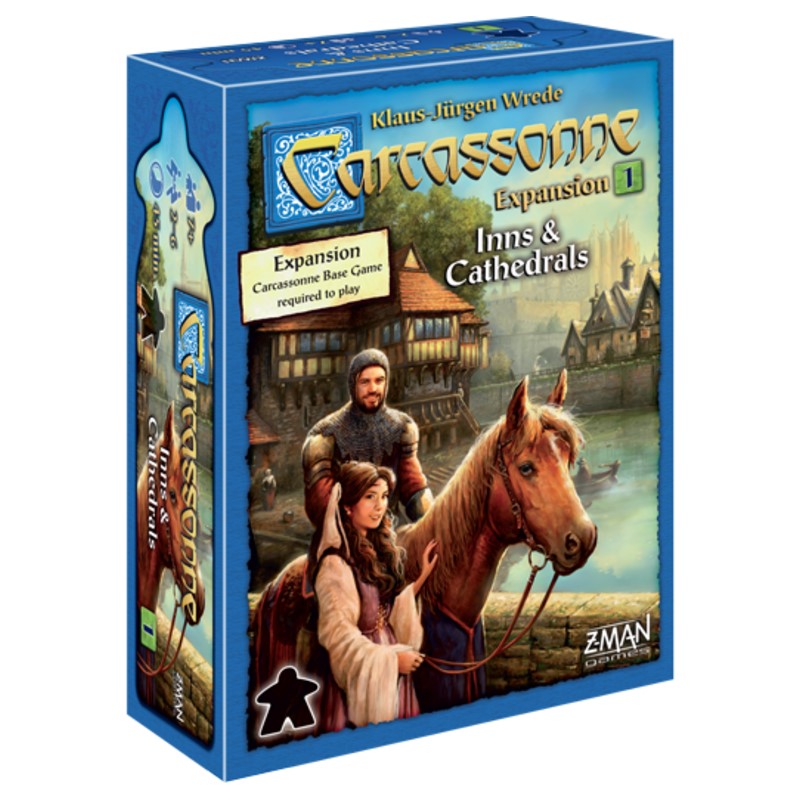 Carcassonne: Die Erweiterung (later prints used the title Inns & Cathedrals) is the first major expansion for Carcassonne and introduces a few new aspects to the game. There are a couple of completely new kinds of tiles - the inns and cathedrals. There are also new tiles that present cities, roads, and cloisters in new shapes. Additionally, each player gets a "big meeple" which counts as two regular meeples. Another whole set of meeples means 6 players can now enjoy the game. Finally, a set of scoring cards helps make score-keeping a little clearer.