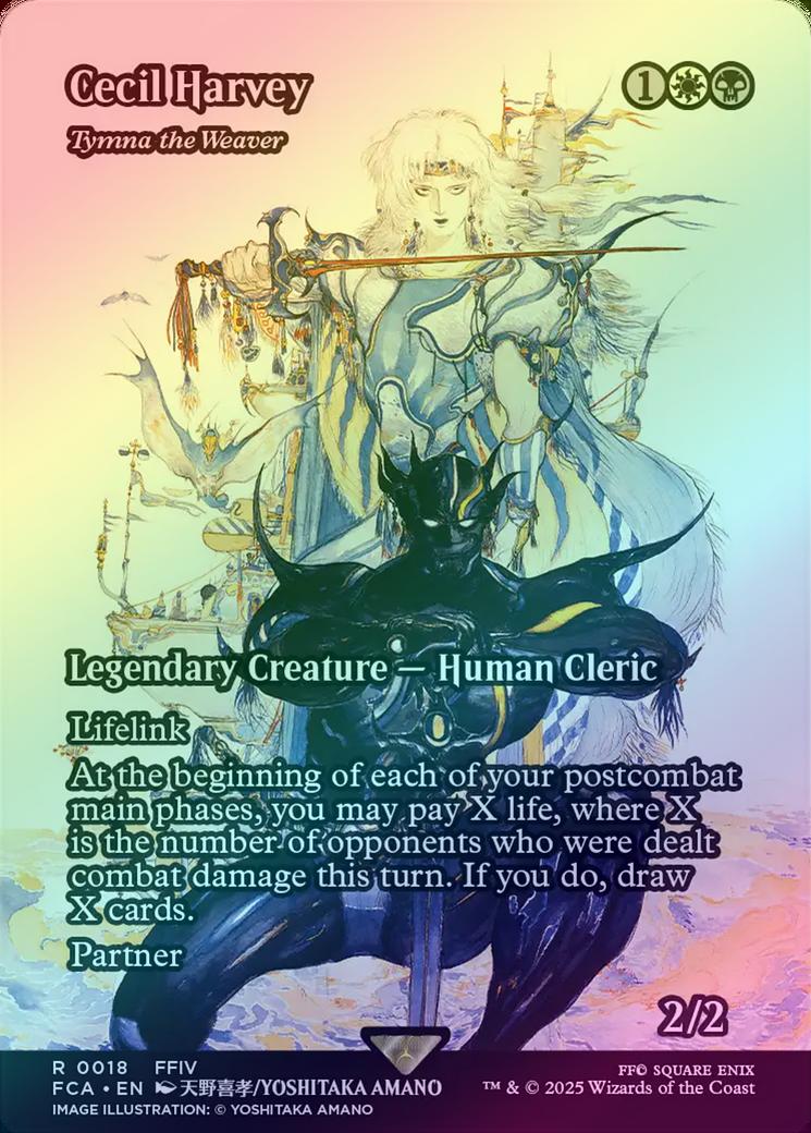Tymna the WeaverCasting Cost: Card Type: Legendary Creature - Human ClericPower/Toughness: 2/2Card Text: Lifelink At the beginning of each of your postcombat main phases, you may pay X life, where X is the number of opponents that were dealt combat damage this turn. If you do, draw X cards. Partner (You can have two commanders if both have partner.)Artist: Yoshitaka Amano