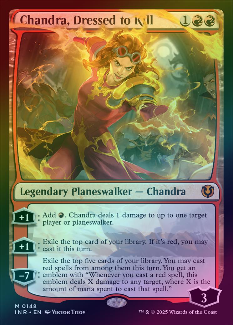 Chandra, Dressed to KillCasting Cost: Card Type: Legendary Planeswalker - ChandraLoyalty: 3Card Text: +1: Add . Chandra, Dressed to Kill deals 1 damage to up to one target player or planeswalker. +1: Exile the top card of your library. If it's red, you may cast it this turn. -7: Exile the top five cards of your library. You may cast red spells from among them this turn. You get an emblem with "Whenever you cast a red spell, this emblem deals X damage to any target, where X is the amount of mana spent to cast that spell."Artist: Viktor Titov