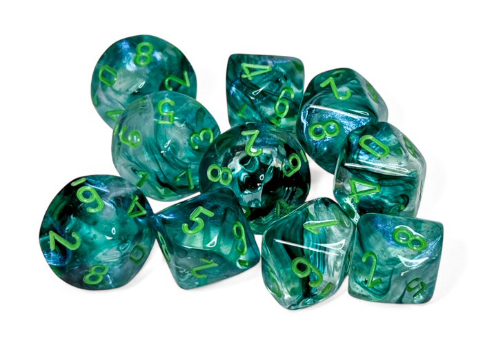 This new dice color from Chessex features translucent light blue with ribbons of opaque dark green in this signature Borealis style with light green paint. Turn out the lights to view the glow-in-the-dark Luminary effect!