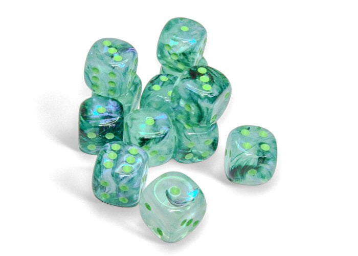 This new dice color from Chessex features translucent light blue with ribbons of opaque dark green in this signature Borealis style with light green paint. Turn out the lights to view the glow-in-the-dark Luminary effect!
