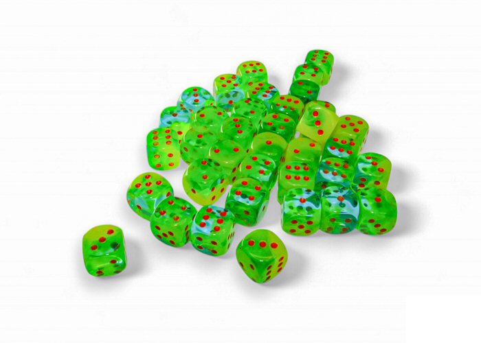 This new dice color from Chessex features a semi-opaque green and translucent teal in the signature Gemini style with orange paint. Turn our the lights to view the glow-in-the-dark Luminary effect!