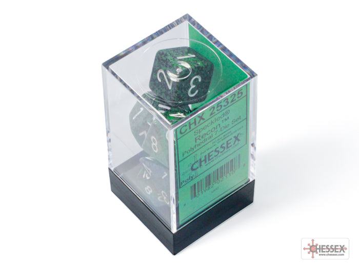 This set contains 7 Speckled Recon dice with white numbers with the following shapes: