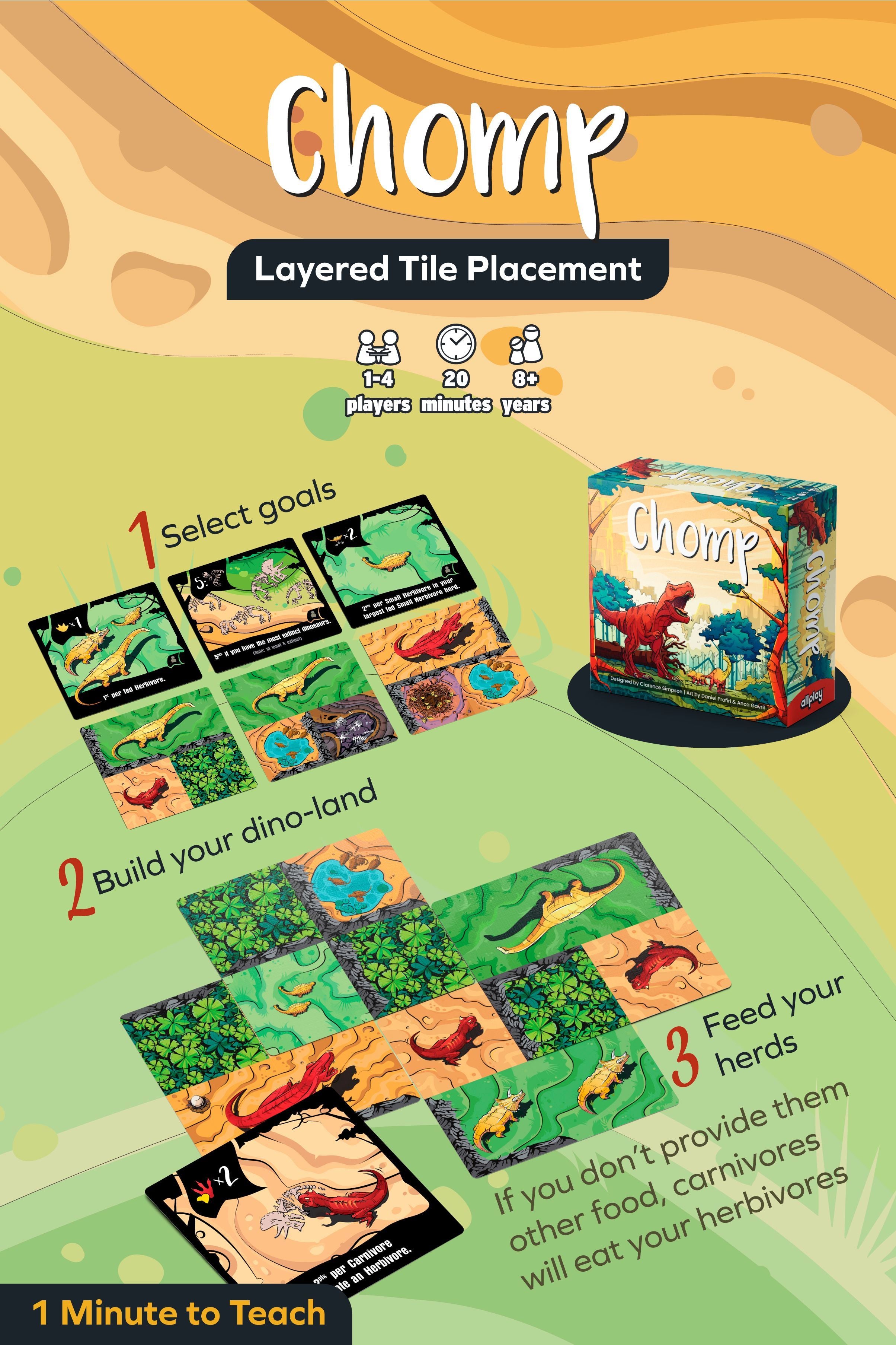 The era of the dinosaurs is here! Your goal in Chomp is to form herds of dinos and make sure they are all fed. Herbivores and carnivores both need food sources, but if the carnies are not properly fed, they don't mind chomping an herbie to fill their bellies!