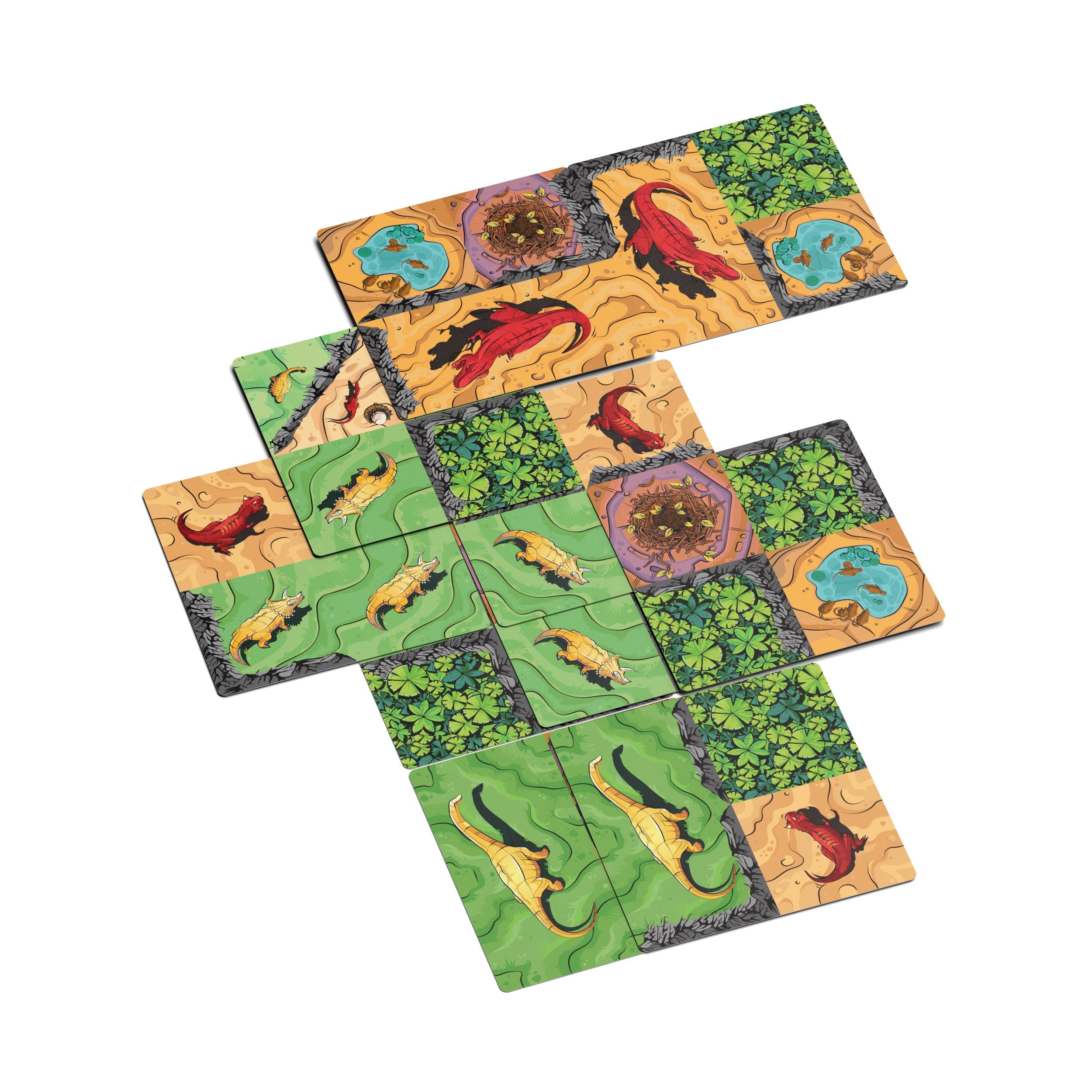 Gameplay involves dual rows of goal tiles and dino tiles, and each turn players select one tile to add to their personal arrangement. Goal tiles stay off to the side for endgame scoring, and dino tiles are arranged in front of each player. Dino tiles include three sizes each of herbivores and carnivores. Each tile must overlap previous ones, either on top of a quarter tile, half tile, or even a whole tile, ensuring that any covered dinos are completely hidden.