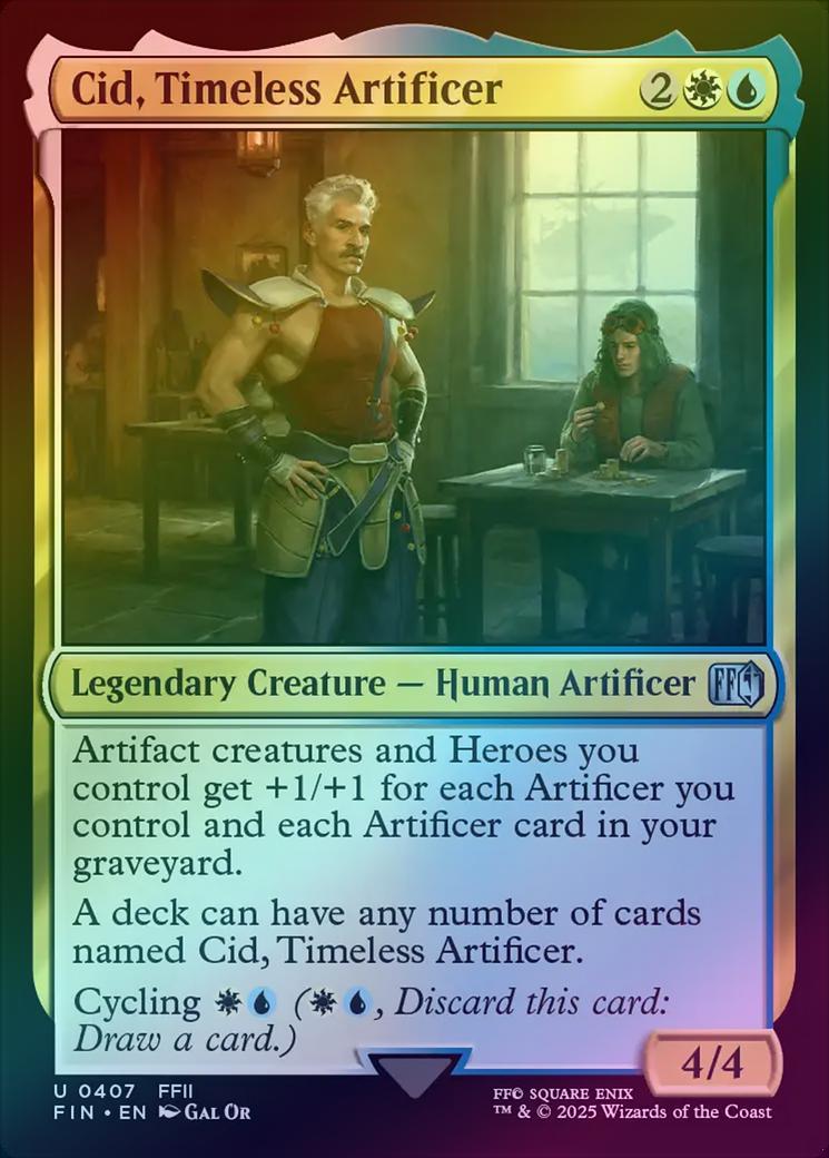 Cid, Timeless ArtificerCasting Cost: Card Type: Legendary Creature - Human ArtificerPower/Toughness: 4/4Card Text: Artifact creatures and Heroes you control get +1/+1 for each Artificer you control and each Artificer card in your graveyard. A deck can have any number of cards named Cid, Timeless Artificer. Cycling (, Discard this card: Draw a card.)Artist: Gal Or