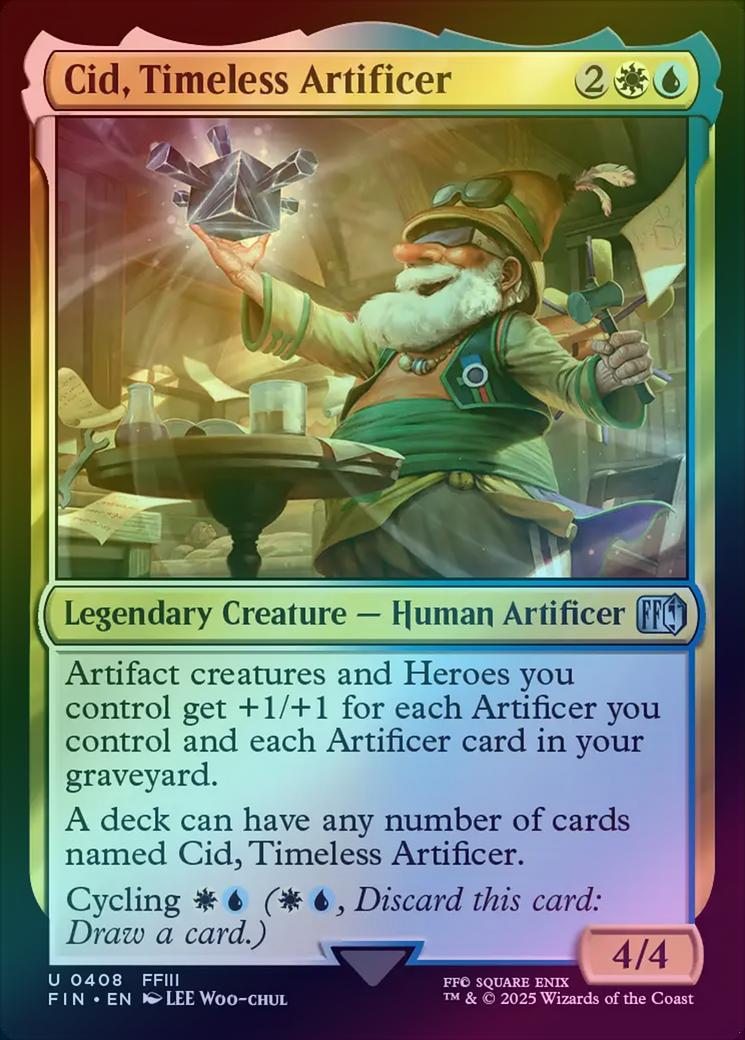 Cid, Timeless ArtificerCasting Cost: Card Type: Legendary Creature - Human ArtificerPower/Toughness: 4/4Card Text: Artifact creatures and Heroes you control get +1/+1 for each Artificer you control and each Artificer card in your graveyard. A deck can have any number of cards named Cid, Timeless Artificer. Cycling (, Discard this card: Draw a card.)Artist: Lee Woo-chul