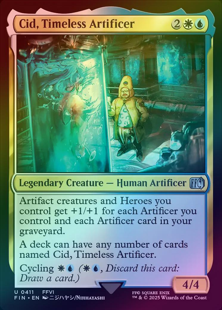 Cid, Timeless ArtificerCasting Cost: Card Type: Legendary Creature - Human ArtificerPower/Toughness: 4/4Card Text: Artifact creatures and Heroes you control get +1/+1 for each Artificer you control and each Artificer card in your graveyard. A deck can have any number of cards named Cid, Timeless Artificer. Cycling (, Discard this card: Draw a card.)Artist: Nijihayashi
