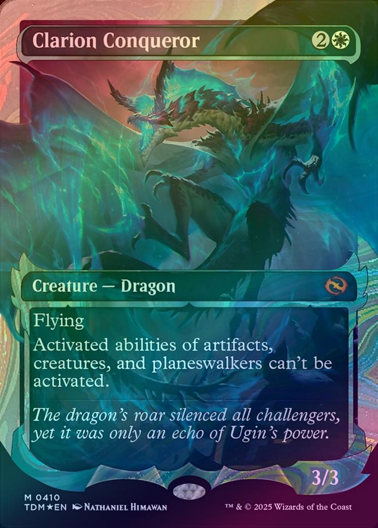 Clarion ConquerorCasting Cost: Card Type: Creature - DragonPower/Toughness: 3/3Card Text: Flying Activated abilities of artifacts, creatures, and planeswalkers can't be activated.Flavour Text: The dragon's roar silenced all challengers, yet it was only an echo of Ugin's power.Artist: Nathaniel Himawan