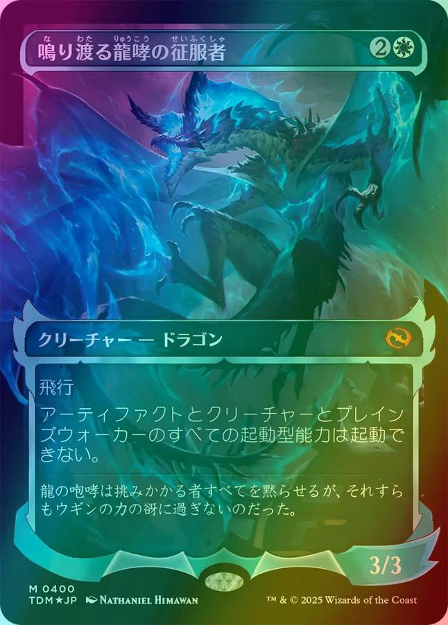Clarion ConquerorCasting Cost: Card Type: Creature - DragonPower/Toughness: 3/3Card Text: Flying Activated abilities of artifacts, creatures, and planeswalkers can't be activated.Flavour Text: The dragon's roar silenced all challengers, yet it was only an echo of Ugin's power.Artist: Nathaniel Himawan