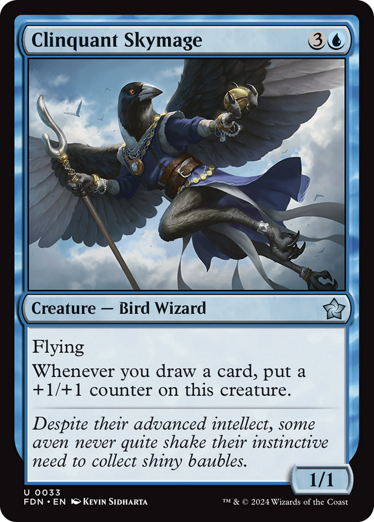 Clinquant SkymageCasting Cost: Card Type: Creature - Bird WizardPower/Toughness: 1/1Card Text: Flying Whenever you draw a card, put a +1/+1 counter on this creature.Flavour Text: Despite their advanced intellect, some aven never quite shake their instinctive need to collect shiny baubles.Artist: Kevin Sidharta