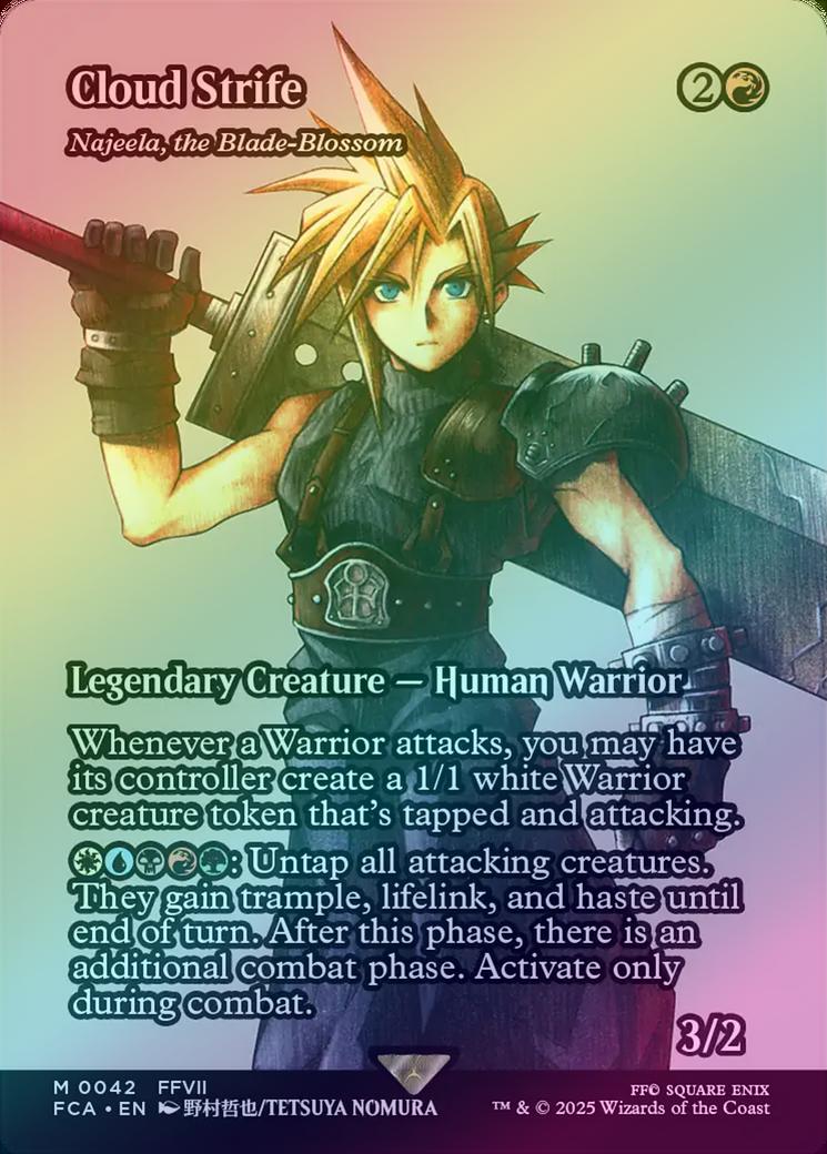 Najeela, the Blade-BlossomCasting Cost: Card Type: Legendary Creature - Human WarriorPower/Toughness: 3/2Card Text: Whenever a Warrior attacks, you may have its controller create a 1/1 white Warrior creature token that's tapped and attacking. : Untap all attacking creatures. They gain trample, lifelink, and haste until end of turn. After this phase, there is an additional combat phase. Activate only during combat.Artist: Tetsuya Nomura