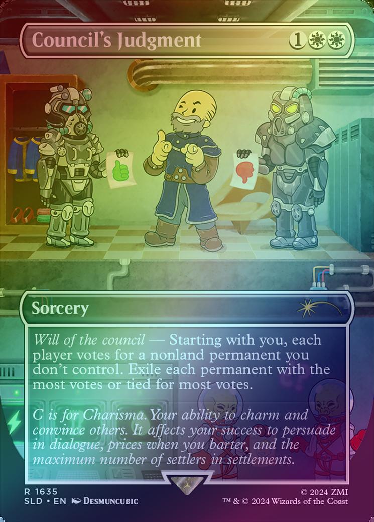 Council's JudgmentCasting Cost: Card Type: SorceryCard Text: Will of the council - Starting with you, each player votes for a nonland permanent you don't control. Exile each permanent with the most votes or tied for most votes.Flavour Text: C is for Charisma. Your ability to charm and convince others. It affects your success to persuade in dialogue, prices when you barter, and the maximum number of settlers in settlements.Artist: Desmuncubic