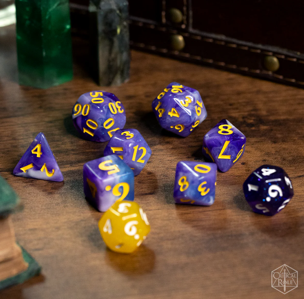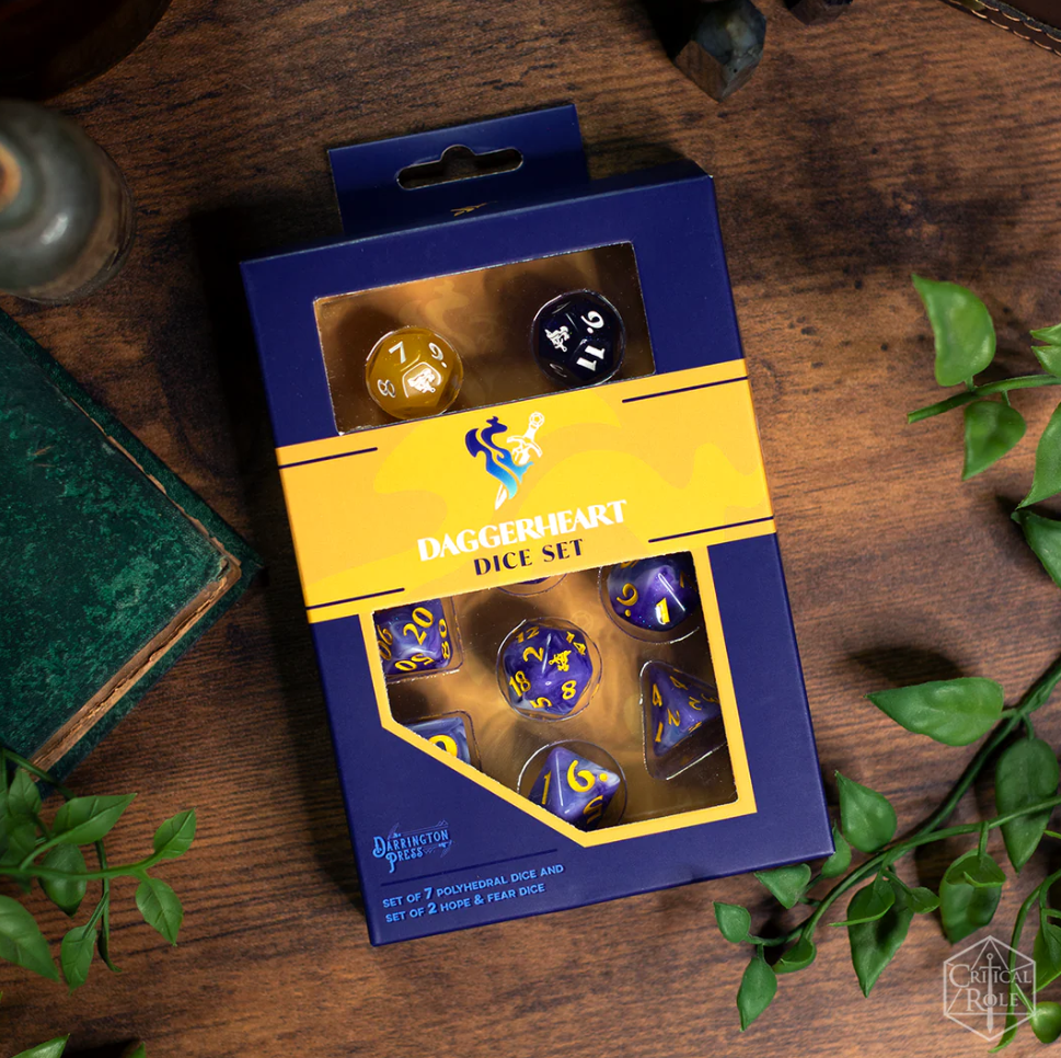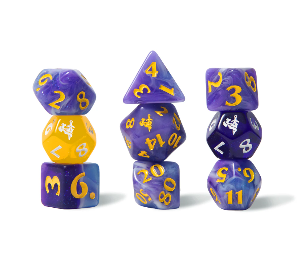 Kick off your newest Daggerheart campaign arming your Hope & Fear rolls with this beautiful dice set made to enrich your gameplay. Housed in a molded plastic tray and custom box, these pretty math rocks are a stunning purple and blue set of 7 polyhedral dice with white swirl, a metallic shimmer, and yellow numbering. It also has 2 additional Daggerheart duality dice (Hope and Fear d12s)—one is navy blue with metallic shimmer and white numbering and the other is gold with metallic shimmer and white numbering. The Daggerheart logo is on the 20-side of the d20 and the 12-side of both the Hope & Fear d12s.