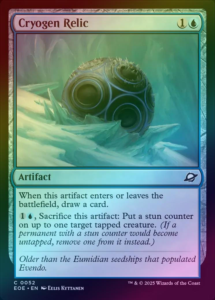 Cryogen RelicCasting Cost: Card Type: ArtifactCard Text: When this artifact enters or leaves the battlefield, draw a card. , Sacrifice this artifact: Put a stun counter on up to one target tapped creature. (If a permanent with a stun counter would become untapped, remove one from it instead.)Flavour Text: Older than the Eumidian seedships that populated Evendo.Artist: Eelis Kyttanen