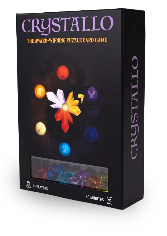 Crystallo is played with a deck of 54 illustrated cards and 18 gems, and runs about 20-30 minutes.