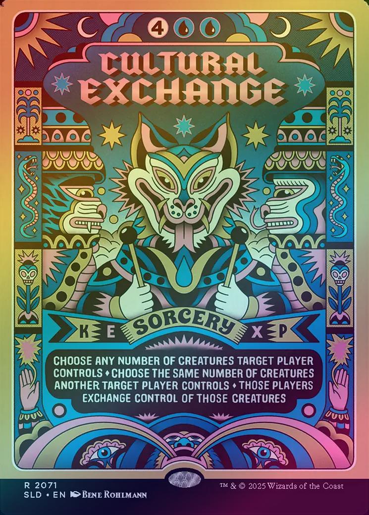 Cultural ExchangeCasting Cost: Card Type: SorceryCard Text: Choose any number of creatures target player controls. Choose the same number of creatures another target player controls. Those players exchange control of those creatures. (This effect lasts indefinitely.)Artist: Bene Rohlmann