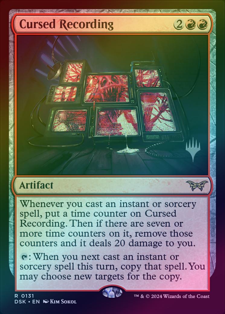 Cursed RecordingCasting Cost: Card Type: ArtifactCard Text: Whenever you cast an instant or sorcery spell, put a time counter on Cursed Recording. Then if there are seven or more time counters on it, remove those counters and it deals 20 damage to you. : When you next cast an instant or sorcery spell this turn, copy that spell. You may choose new targets for the copy.Artist: Kim Sokol
