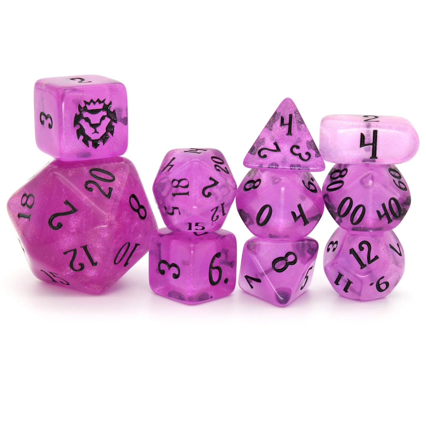 Lich Queen Barbie is a 10-piece set of translucent, glittery, bright pink dice inked in nightmare black. Phylactery, Shambling Horde of Kens, and Legendary Resistances not included.