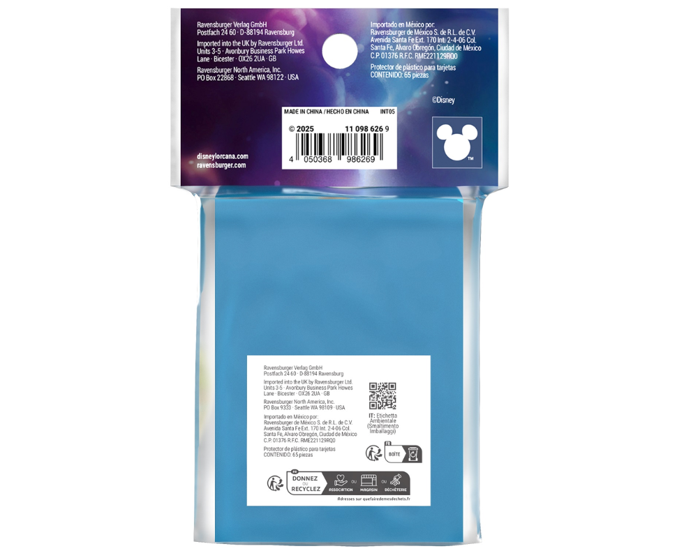 Each pack contains 65 matte-finish card sleeves featuring a Disney Lorcana TCG glimmer.