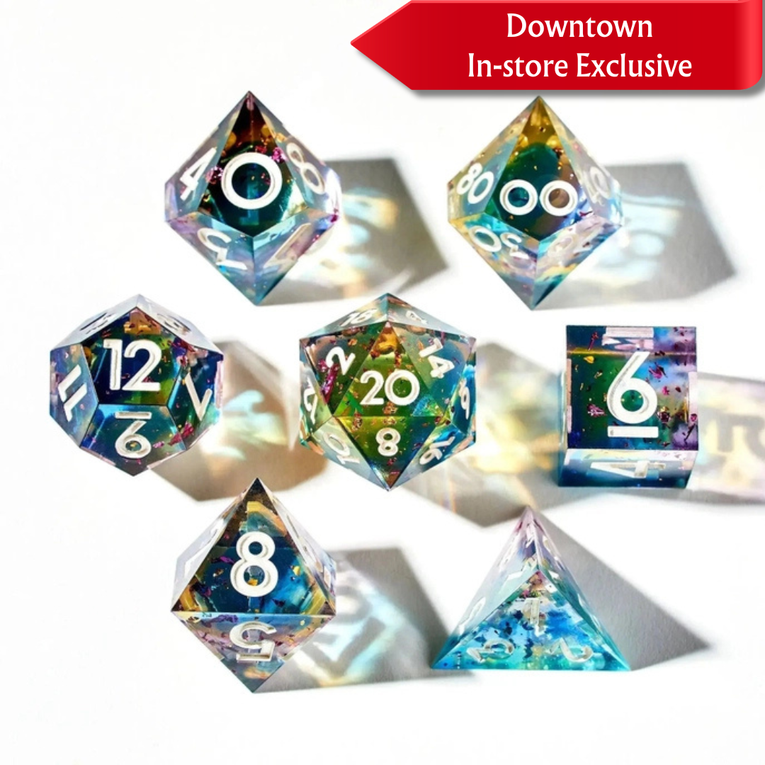 Every artisan set is hand-poured, so the dice may have slight differences in color and material suspension. Please understand that each die is one of a kind due to how they're crafted.