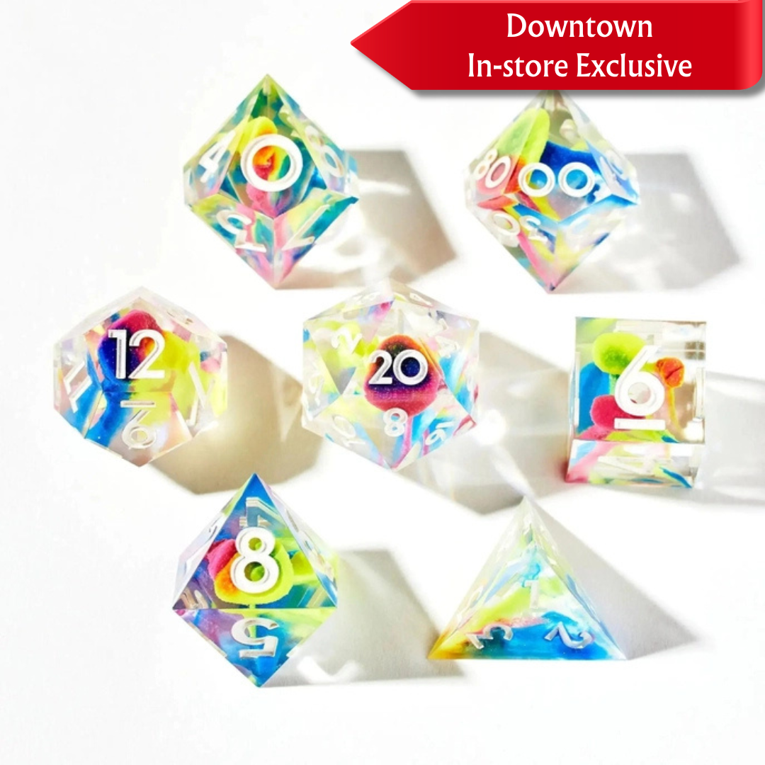 Inspired by the DnD 5e spell of the same name, our Color Spray dice are made from resin with swirls of blue, pink, and red. Combined with iridescent flakes and white numbering, these dice will surely put a spell on your party... or any other elves, goblins, ogres, or other creatures you may encounter.