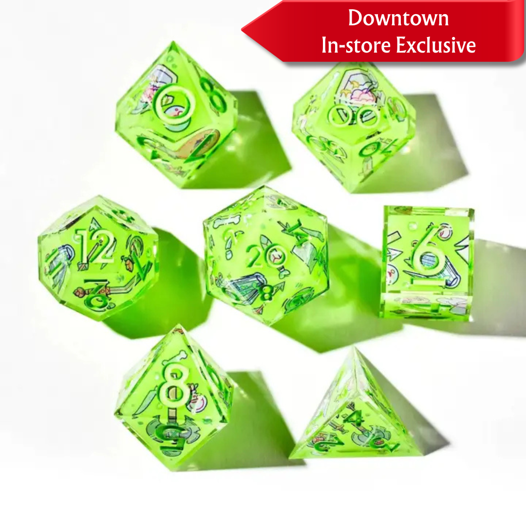 As an homage to one of the most recognizable monsters in Dungeons & Dragons lore, we have recreated these mindless gelatinous cubes as a 7-piece Iconic RPG Dice set.