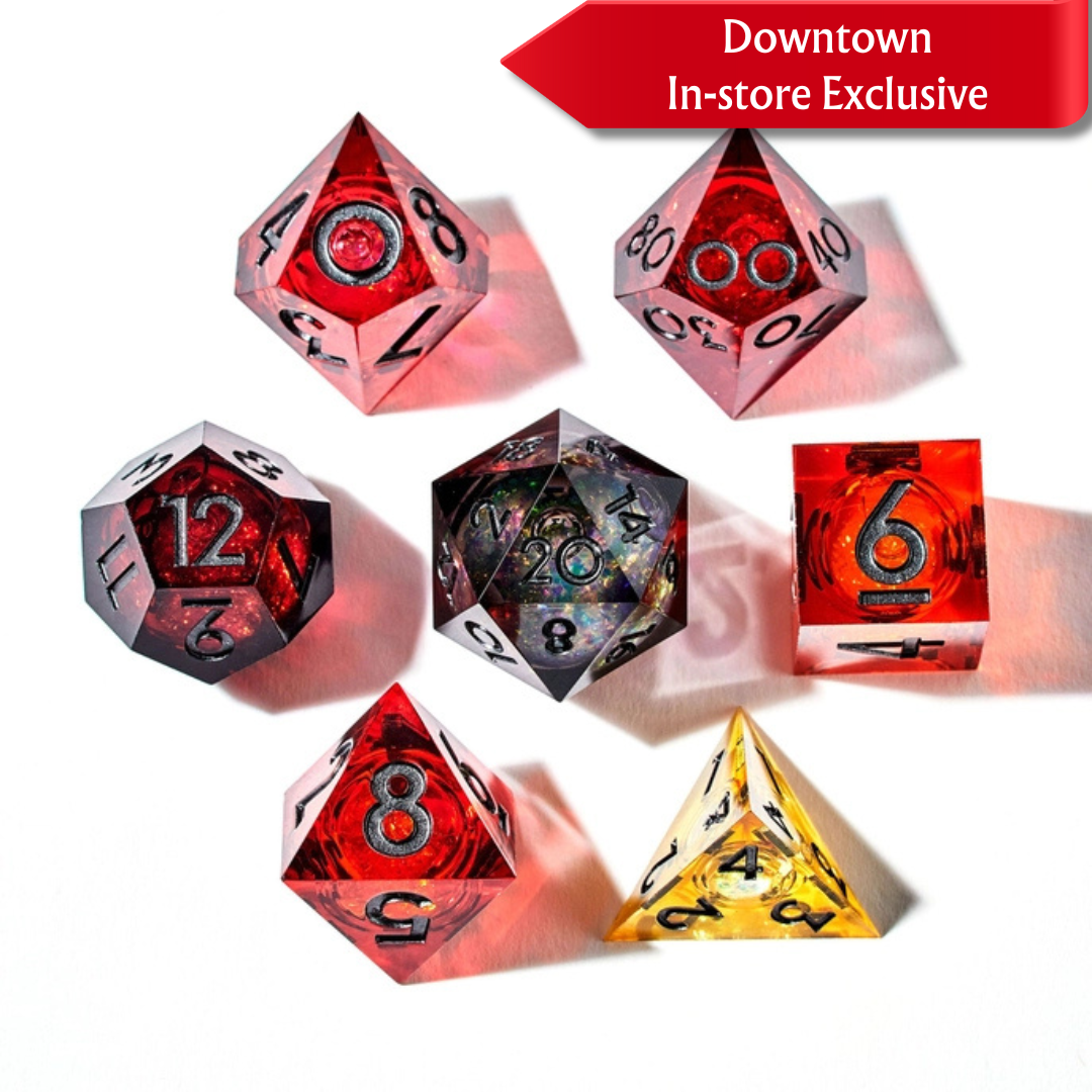 - Each 7-piece set includes one D4, D6, D8, D10, D%, D12, and D20.