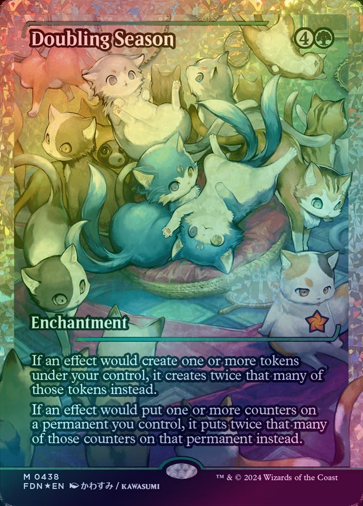 Doubling SeasonCasting Cost: Card Type: EnchantmentCard Text: If an effect would create one or more tokens under your control, it creates twice that many of those tokens instead. If an effect would put one or more counters on a permanent you control, it puts twice that many of those counters on that permanent instead.Artist: Kawasumi