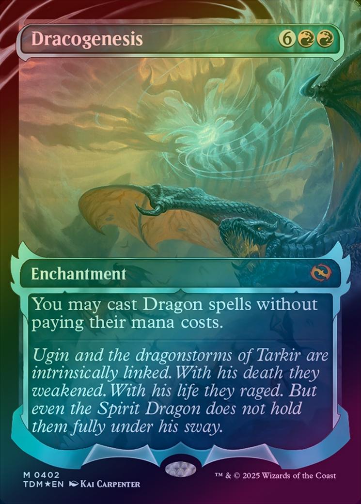DracogenesisCasting Cost: Card Type: EnchantmentCard Text: You may cast Dragon spells without paying their mana costs.Flavour Text: Ugin and the dragonstorms of Tarkir are intrinsically linked. With his death they weakened. With his life they raged. But even the Spirit Dragon does not hold them fully under his sway.Artist: Kai Carpenter