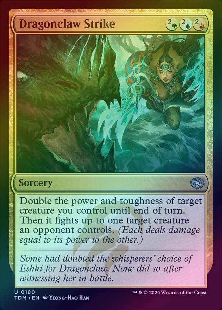 Dragonclaw StrikeCasting Cost: Card Type: SorceryCard Text: Double the power and toughness of target creature you control until end of turn. Then it fights up to one target creature an opponent controls. (Each deals damage equal to its power to the other.)Flavour Text: Some had doubted the whisperers' choice of Eshki for Dragonclaw. None did so after witnessing her in battle.Artist: Yeong-Hao Han