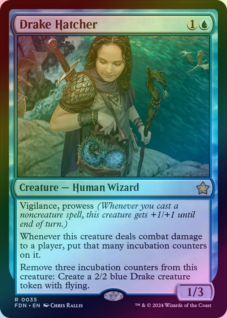 Drake HatcherCasting Cost: Card Type: Creature - Human WizardPower/Toughness: 1/3Card Text: Vigilance, prowess (Whenever you cast a noncreature spell, this creature gets +1/+1 until end of turn.) Whenever this creature deals combat damage to a player, put that many incubation counters on it. Remove three incubation counters from this creature: Create a 2/2 blue Drake creature token with flying.Artist: Chris Rallis