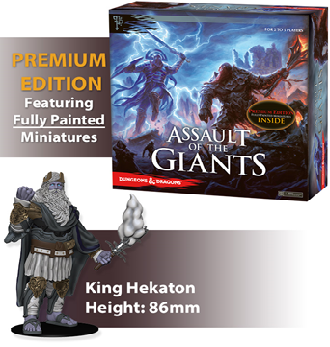 Assault of the Giants Premium Edition is a new Dungeons & Dragons board game designed by Andrew Parks. Designed for 3-6 players, Assault of the Giants challenges players to command one of the six types of giants and claim the right to rule over all giantkind. Command giants and assault settlements to score points and secure important resources, including food, treasure, ore, and runes. Contents include 12 fully painted Giants miniatures, measuring from approximately 20mm to 90mm in height, and three Giantslayers!