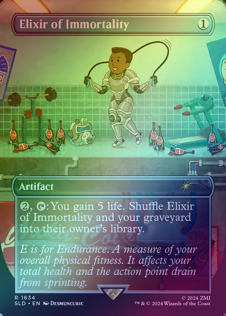 Elixir of ImmortalityCasting Cost: Card Type: ArtifactCard Text: , : You gain 5 life. Shuffle Elixir of Immortality and your graveyard into their owner's library.Flavour Text: E is for Endurance. A measure of your overall physical fitness. It affects your total health and the action point drain from sprinting.Artist: Desmuncubic