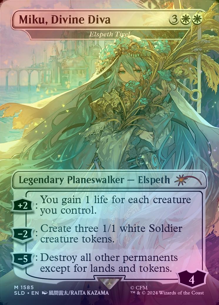 Elspeth TirelCasting Cost: Card Type: Legendary Planeswalker - ElspethLoyalty: 4Card Text: +2: You gain 1 life for each creature you control. -2: Create three 1/1 white Soldier creature tokens. -5: Destroy all other permanents except for lands and tokens.Artist: Raita Kazama