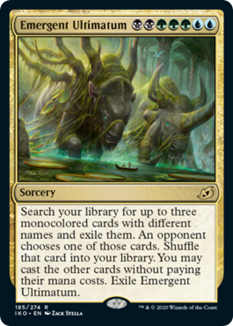 Emergent Ultimatum (Extended Art)Casting Cost: Card Type: SorceryCard Text: Search your library for up to three different monocolored cards with different names and exile them. An opponent chooses one of those cards. Shuffle that card into your library. You may cast the other cards without paying their mana costs. Exile Emergent Ultimatum.Artist: Zack StellaRarity: Rare