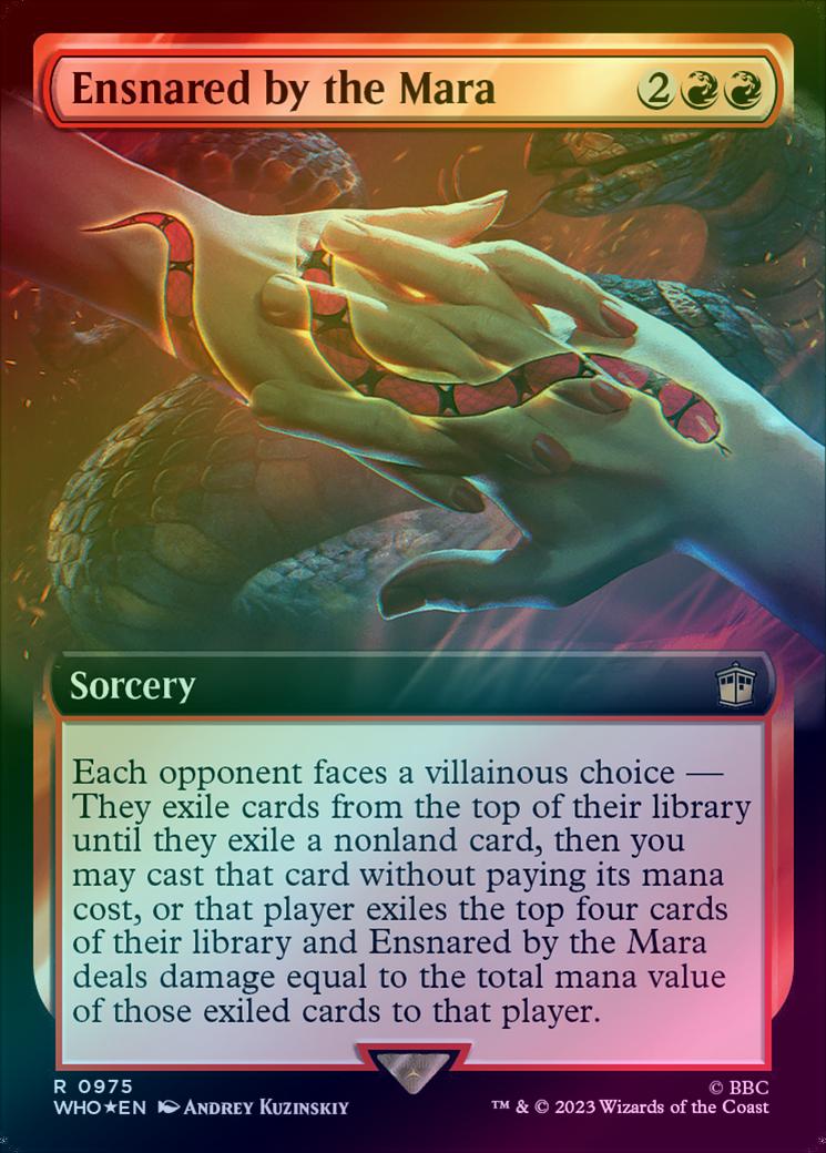 Ensnared by the MaraCasting Cost: Card Type: SorceryCard Text: Each opponent faces a villainous choice - They exile cards from the top of their library until they exile a nonland card, then you may cast that card without paying its mana cost, or that player exiles the top four cards of their library and Ensnared by the Mara deals damage equal to the total mana value of those exiled cards to that player.Artist: Andrey Kuzinskiy