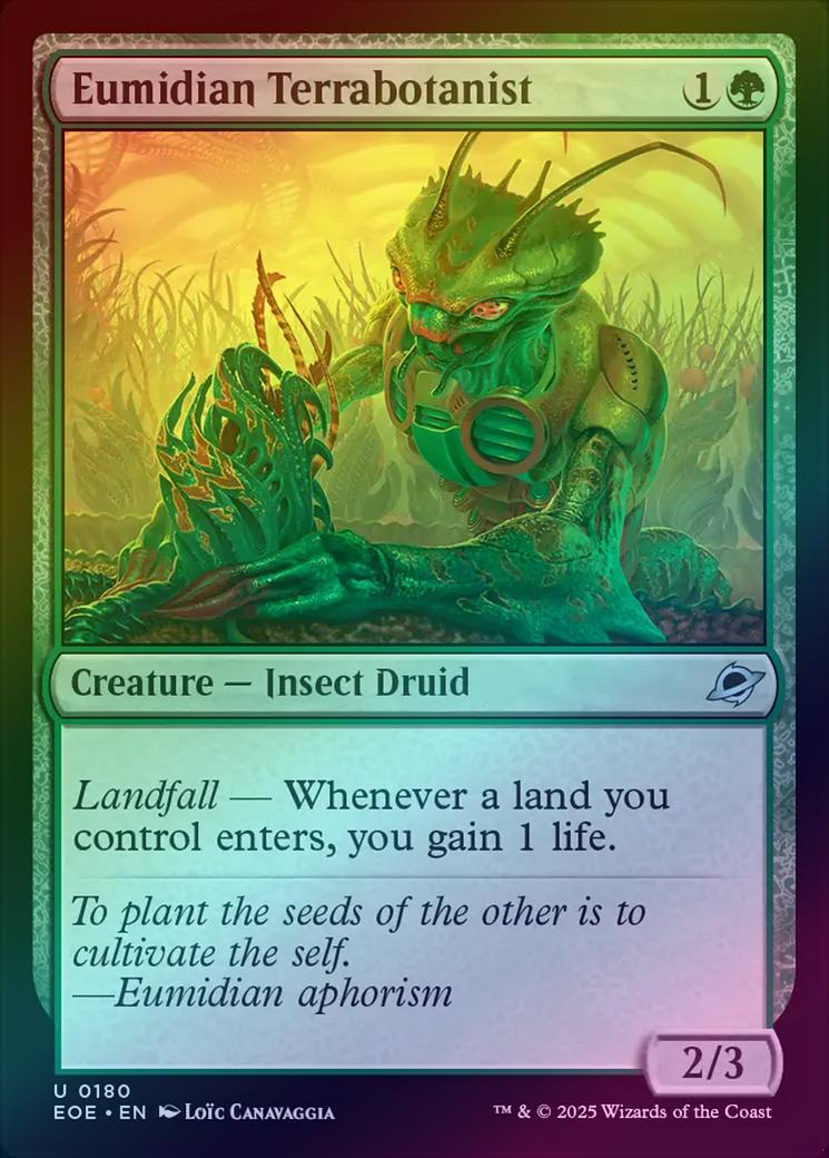 Eumidian TerrabotanistCasting Cost: Card Type: Creature - Insect DruidPower/Toughness: 2/3Card Text: Landfall - Whenever a land you control enters, you gain 1 life.Flavour Text: To plant the seeds of the other is to cultivate the self. -Eumidian aphorismArtist: Loc Canavaggia