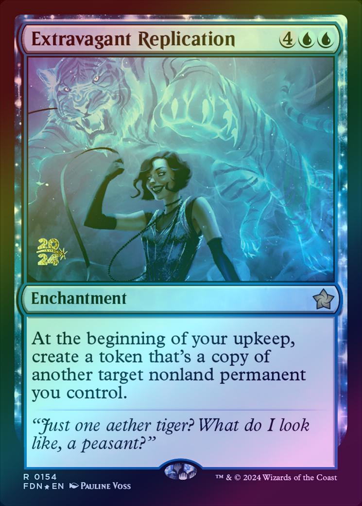 Extravagant ReplicationCasting Cost: Card Type: EnchantmentCard Text: At the beginning of your upkeep, create a token that's a copy of another target nonland permanent you control.Flavour Text: "Just one aether tiger? What do I look like, a peasant?"Artist: Pauline Voss