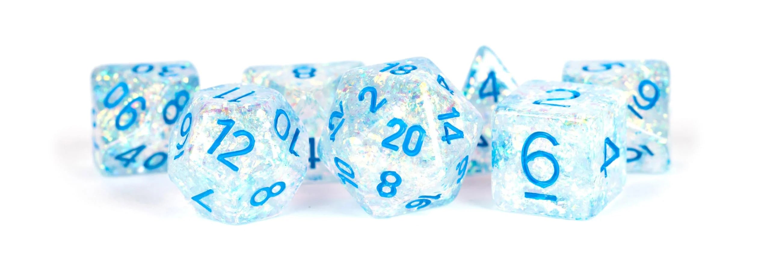 MDG - Resin Poly Dice Set - 16mm Flash Dice: Clear w/ Light Blue Numbers