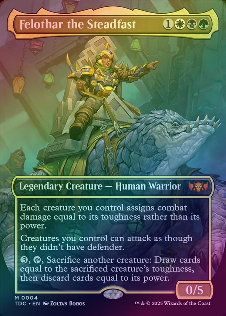 Felothar the SteadfastCasting Cost: Card Type: Legendary Creature - Human WarriorPower/Toughness: 0/5Card Text: Each creature you control assigns combat damage equal to its toughness rather than its power. Creatures you control can attack as though they didn't have defender. , , Sacrifice another creature: Draw cards equal to the sacrificed creature's toughness, then discard cards equal to its power.Artist: Zoltan Boros