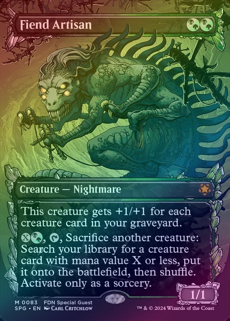 Fiend ArtisanCasting Cost: Card Type: Creature - NightmarePower/Toughness: 1/1Card Text: Fiend Artisan gets +1/+1 for each creature card in your graveyard. , , Sacrifice another creature: Search your library for a creature card with mana value X or less, put it onto the battlefield, then shuffle. Activate only as a sorcery.Artist: Carl Critchlow