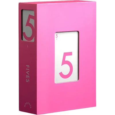 Fives is a trick-taking game for three or four players. The reverse side of the cards shows a magenta 5.