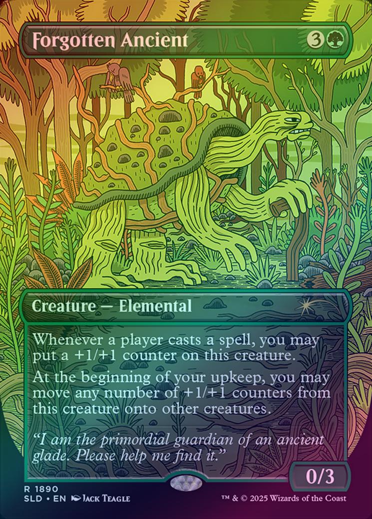 Forgotten AncientCasting Cost: Card Type: Creature - ElementalPower/Toughness: 0/3Card Text: Whenever a player casts a spell, you may put a +1/+1 counter on this creature. At the beginning of your upkeep, you may move any number of +1/+1 counters from this creature onto other creatures.Flavour Text: "I am the primordial guardian of an ancient glade. Please help me find it."Artist: Jack Teagle