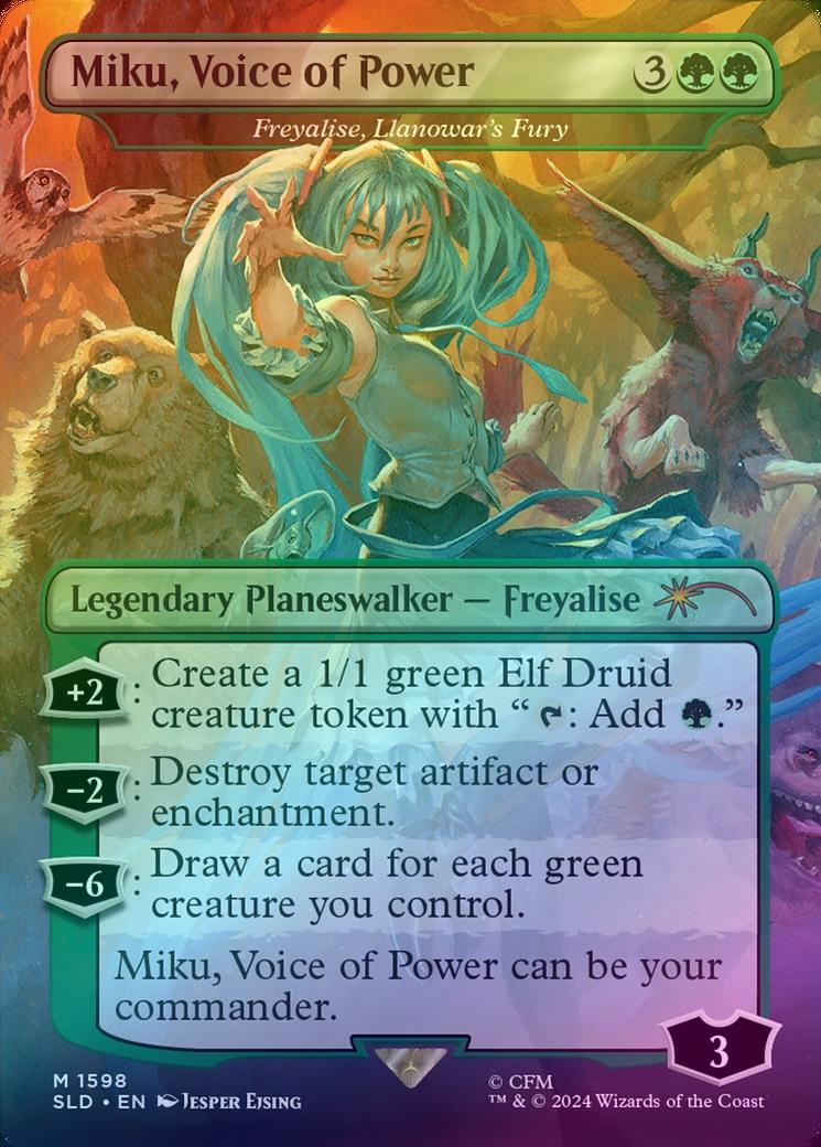 Freyalise, Llanowar's FuryCasting Cost: Card Type: Legendary Planeswalker - FreyaliseLoyalty: 3Card Text: +2: Create a 1/1 green Elf Druid creature token with ": Add ." -2: Destroy target artifact or enchantment. -6: Draw a card for each green creature you control. Freyalise, Llanowar's Fury can be your commander.Artist: Jesper Ejsing
