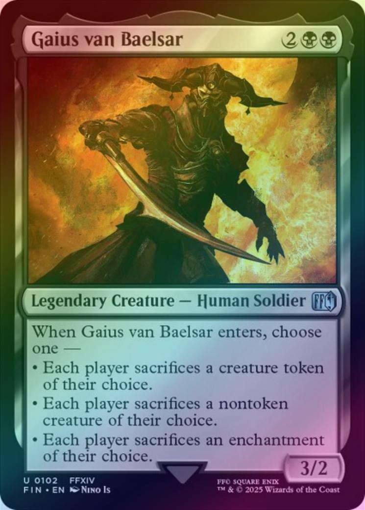 Gaius van BaelsarCasting Cost: Card Type: Legendary Creature - Human SoldierPower/Toughness: 3/2Card Text: When Gaius van Baelsar enters, choose one - - Each player sacrifices a creature token of their choice. - Each player sacrifices a nontoken creature of their choice. - Each player sacrifices an enchantment of their choice.Artist: Nino Is