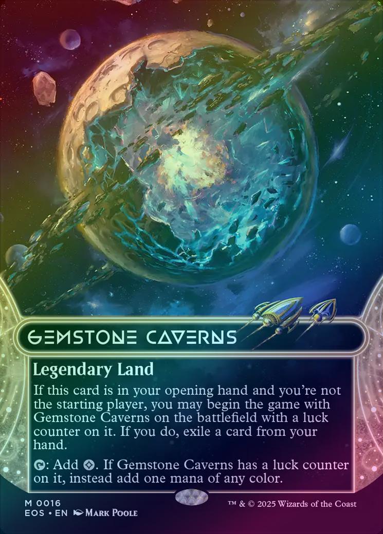 Gemstone CavernsCard Type: Legendary LandCard Text: If this card is in your opening hand and you're not the starting player, you may begin the game with Gemstone Caverns on the battlefield with a luck counter on it. If you do, exile a card from your hand. : Add . If Gemstone Caverns has a luck counter on it, instead add one mana of any color.Artist: Mark Poole