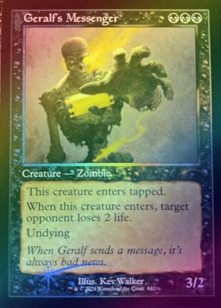 Geralf's MessengerCasting Cost: Card Type: Creature - ZombiePower/Toughness: 3/2Card Text: This creature enters tapped. When this creature enters, target opponent loses 2 life. Undying (When this creature dies, if it had no +1/+1 counters on it, return it to the battlefield under its owner's control with a +1/+1 counter on it.)Flavour Text: When Geralf sends a message, it's always bad news.Artist: Kev Walker
